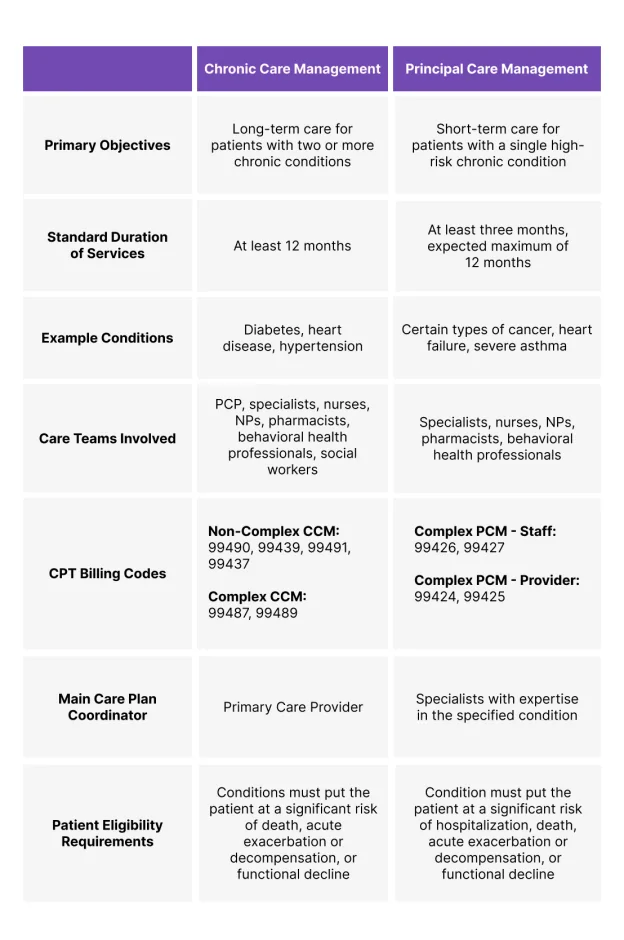Principal Care Management (PCM) and Chronic Care Management (CCM) services are available to patients covered by Medicare Part B, aiming to improve the lives of those with chronic conditions. While they share numerous similarities, there are some important differences that healthcare providers need to know in order to maximize reimbursement opportunities. Today, we’ll use a handy little chart to compare and contrast the two.