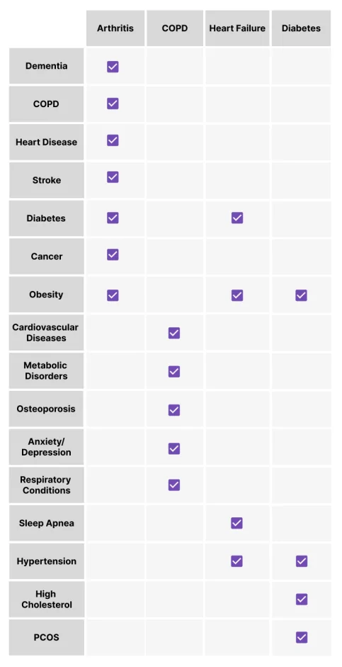 As CMS’s guidelines state, patients must have two or more chronic conditions present to be considered for CCM. Below is a visual representation of some multimorbid conditions that are common in those who qualify.